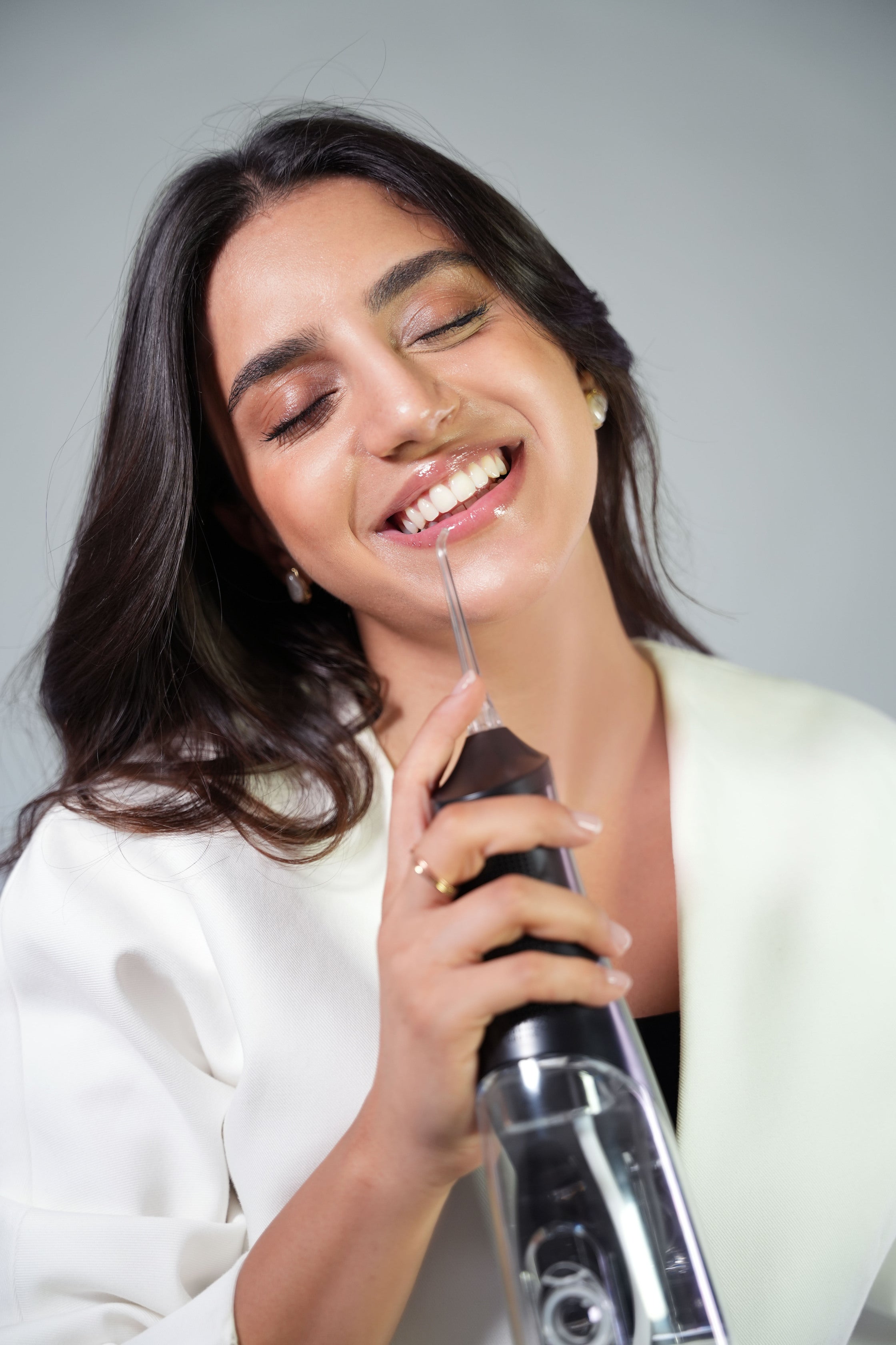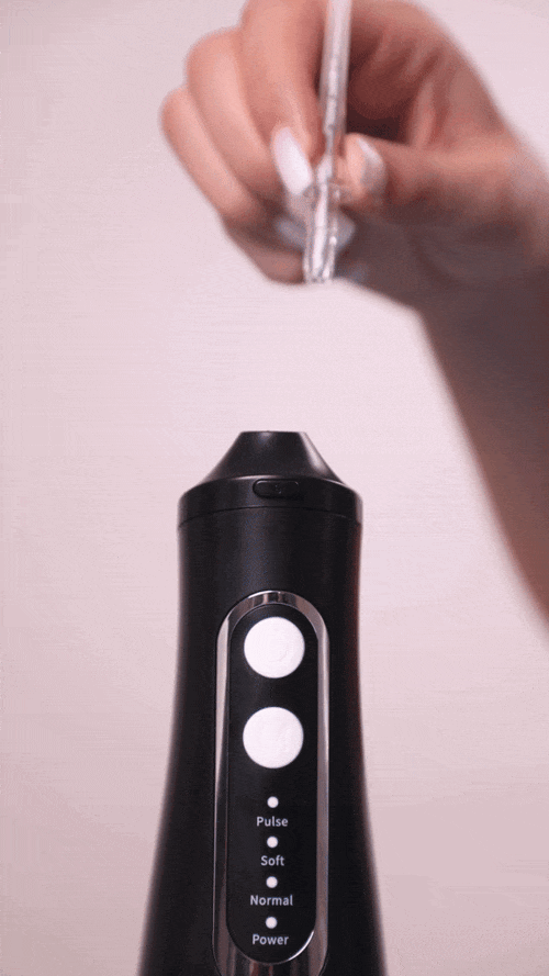 Tap the mode key to select your desired mode then place the nozzle into your mouth. Adjust the modes according to your needs, starting with the soft mode if you are new to using it. Hold the device upright and with the nozzle in your mouth press the power button and slightly part your lips to release the water build up. When using over the sink, lean forward slightly.